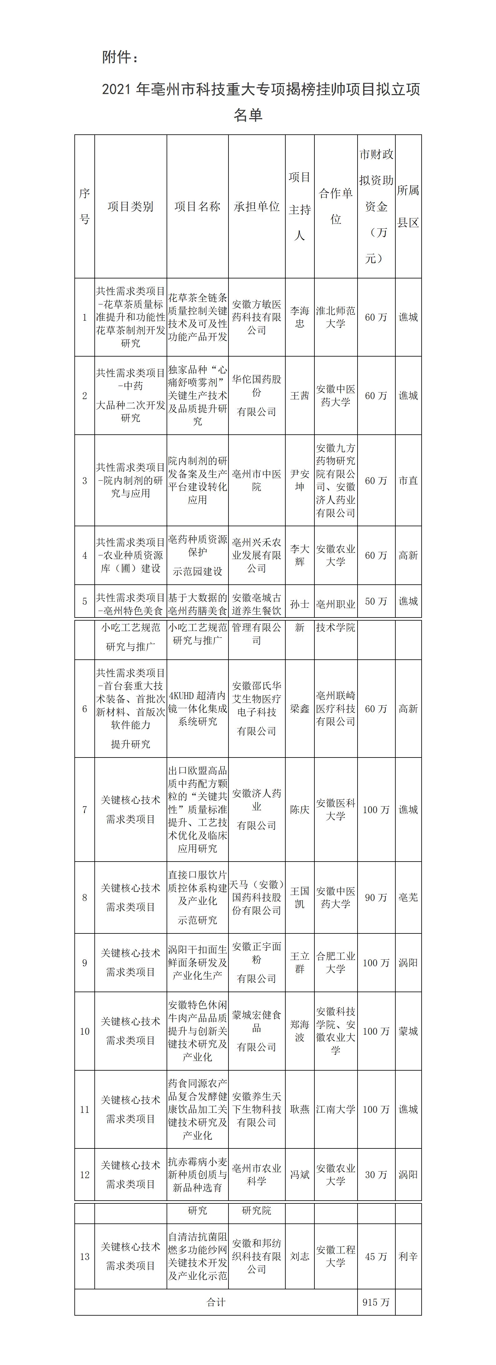 根據《關于發布2021年市科技重大專項揭榜掛帥項目張榜清單(申報指南)的通知》(亳科〔2021〕50號),經組織申報、專家評審、會議研究等程序,2021年亳州市科技重大專項揭榜掛帥項目擬立項13項(詳見附件),其中共性需求類項目6項,關鍵核心技術需求類項目7項,現予以公示。
